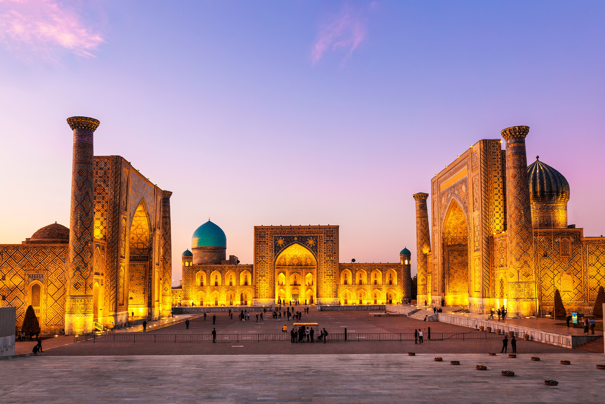 Θα επισκεφθούμε την περίφημη πλατεία Registan, με τις τρεις μεγαλοπρεπείς μεντρεσέδες Ulugbek, Sher-Dor και Tilla-Qori, το μεγαλοπρεπές τέμενος Bibi Khanym, το μαυσωλείο Gur-e-Amir, το Αστεροσκοπείο του Ουλουγκμπέκ και το επιβλητικό Νεκροταφείο Shah-i-Zinda, ένα από τα πιο ιερά σημεία της πόλης.